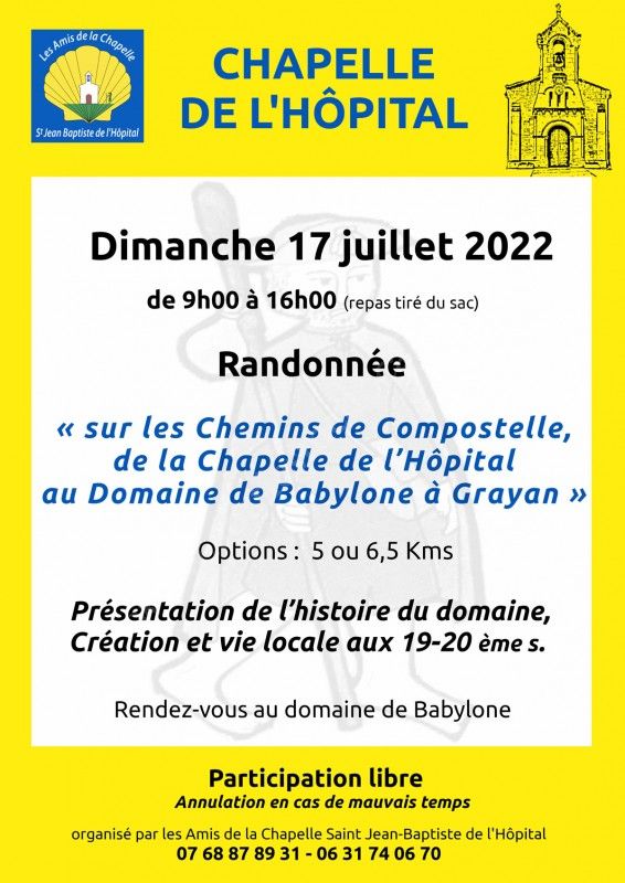 L’association « Les Amis de la Chapelle Saint Jean-Baptiste de l’Hôpital » organise une animation exceptionnelle qui lie deux des plus notables patrimoines bâtis de la commune de Grayan-et-l'Hôpital, sur les Chemins de Compostelle : la Chapelle de l'Hôpital et le Domaine de Babylone.