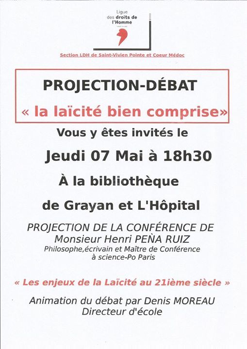 La Ligue des Droits de l'Homme, section LDH de Saint-Vivien Pointe et Coeur Médoc vous invite à une Projection / Débat "La Laïcité Bien Comprise".