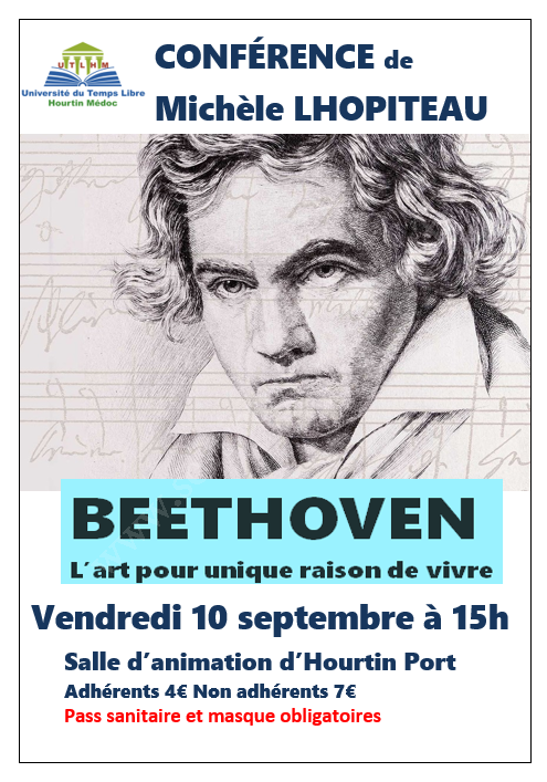 La musicologue Michèle LHOPITEAU, que nous avons récemment vu sur France2 dans l'émission sur Mozart, viendra faire une conférence sur la vie et l'oeuvre de Beethoven, en l'agrémentant de nombreux extraits musicaux qu'elle commentera.