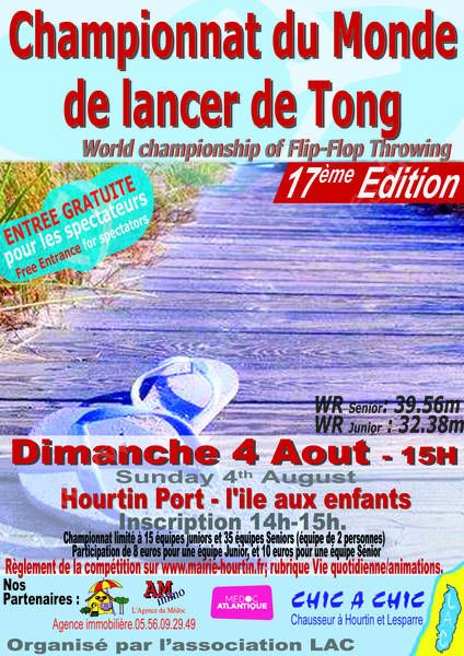 "Créé par l’association L.A.C. en 2003.Ce championnat est le seul lancé au monde qui se pratique par équipe de 2 personnes : le lanceur qui lance sa tong au pied, et le rattrapeur qui doit la rattraper de volée. 2 catégories ouvertes pour cette compétition: les Juniors, si les 2 compétiteurs ont moins de 15 ans ; Les Seniors dans les autres configurations. Compétition limitée à 15 équipes Junior et 35 équipes Sénior 3 critères de classement pour chaque catégorie : la plus grande distance, le meilleur cumul des 5 lancers, et une note artistique décernée par un jury dédié. Un contrôle technique vérifiera que la tong est dans un matériau souple, et qu’elle ne pèse pas plus de 225 grammes. Chaque équipe procèdera à une première série de 3 lancers consécutifs, dans l’ordre croissant des numéros de dossards. Puis elles feront une seconde série de 2 lancers consécutifs, toujours par ordre croissant de numéro. Records en vigueur (plus grande distance): 32,38 m en catégorie Junior, et 39,56 m en Sénior."