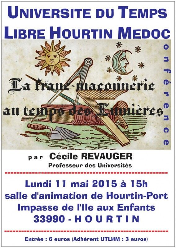 Cette conférence qui a pour thème "La Franc-maçonnerie au temps des Lumières" sera animée par Cécile REVAUGER, Professeur des Universités à Bordeaux III, auteur d'une thèse sur la Franc-maçonnerie en Angleterre et aux Etats Unis au XVIIIème siècle, agrégée d'anglais et docteur d'Etat, saura, j'en suis sûre, retenir votre plus vif intérêt.