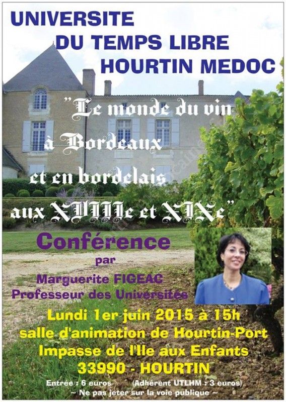 Cette conférence, ne manquera pas d'intérêt assurément! En effet, Marguerite FIGEAC, qui interviendra pour nous ce jour là sur "Le monde du vin à Bordeaux et en bordelais aux XVIIIe et XIXe", est professeur à l'Université Montaigne de Bordeaux et a trois axes principaux de recherche :