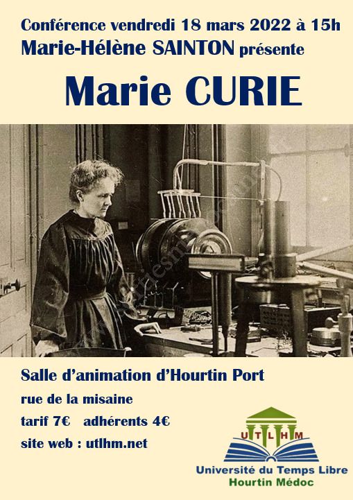 Conférence sur "Marie Curie" par Marie-Hélène SAINTON, proposée par l'Université du Temps Libre - Hourtin Médoc