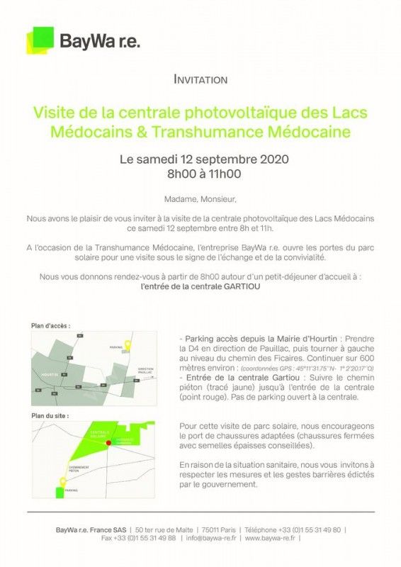 A l'occasion de la Transhumance Médocaine 2020, la société BayWa r.e. France vous ouvre les portes du parc solaire pour une visite sous le signe de l'échange et de la convivialité.