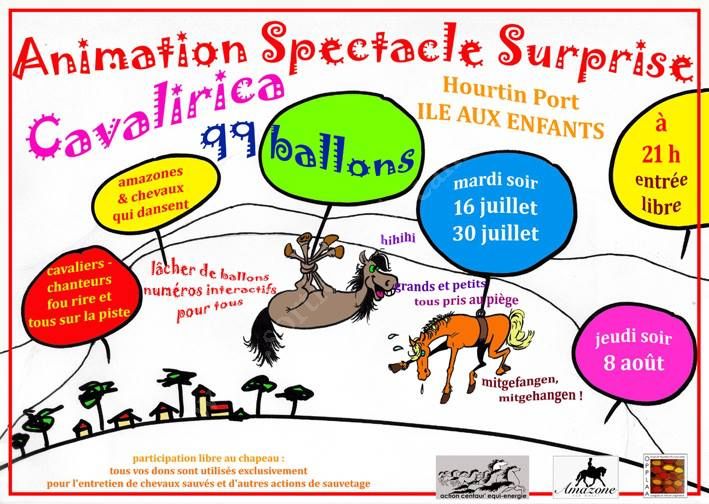 CAVALIRICA – animation-surprise avec les chevaux de l’association Action Centaur’ Aquitaine, qui sont d’une gentillesse si extraordinaire que grands et petits pourront danser et jouer avec eux pendant les plages interactives que le scénario réserve à la convivialité et à la participation sans frontières.
