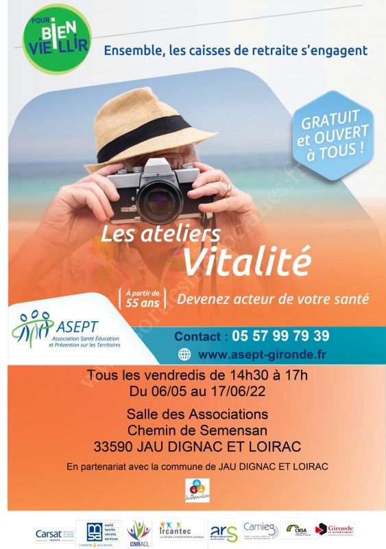 L'ASEPT, en partenariat avec la commune de Jau-Dignac-et-Loirac, vous propose des ateliers Vitalité tous les vendredis du 6 mai 2022 au 17 juin 2022.