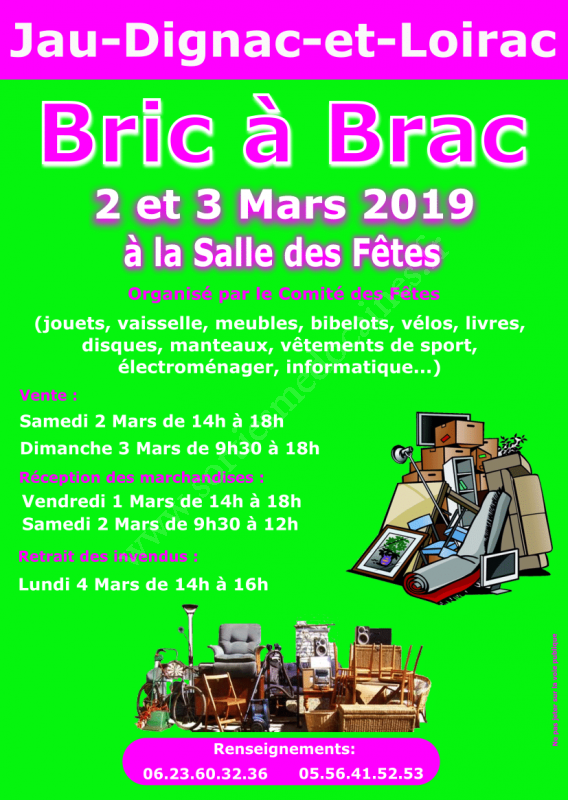 Le Comité des Fêtes organise son Bric à Brac le 2 et 3 Mars 2019 à la salle des fêtes de Jau-Dignac et Loirac.
