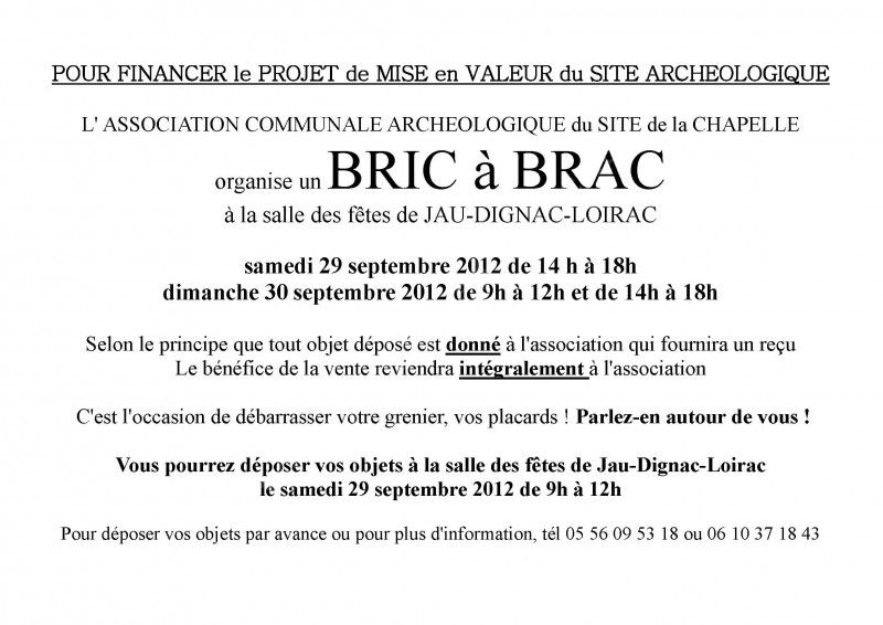 Pour financer le projet de mise en valeur du site archeologique l'Association Communale Archeologique du site de la Chapelle organise un bric à brac.