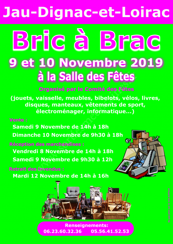 Le Comité des Fêtes organise son Bric à Brac le 9 et 10 Novembre 2019 à la salle des fêtes de Jau-Dignac et Loirac.