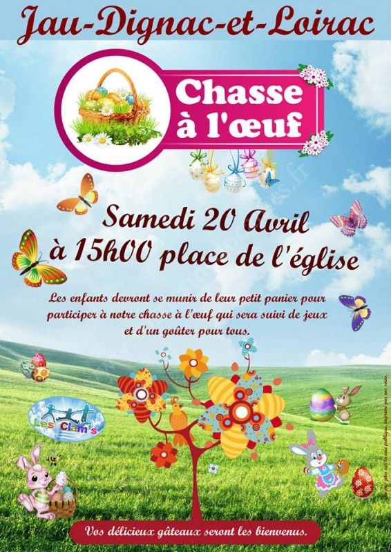 Préparez tous vos petits paniers !!!! Pour participer à la chasse à l’œuf des CLAM'S le samedi 20 avril 2019 sur la place de l'église.