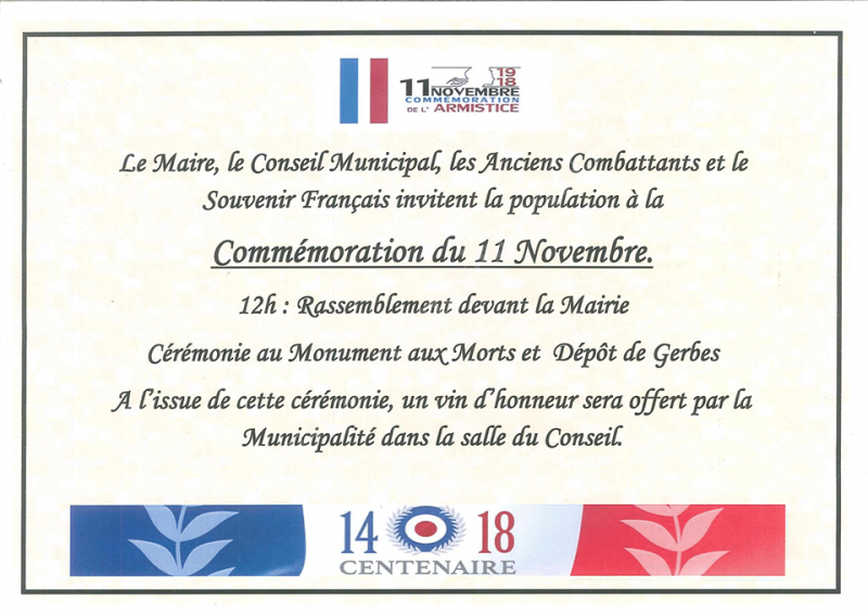 La commémoration du centenaire de l'Armistice du 11 novembre 1918 se déroulera le dimanche 11 novembre 2018.