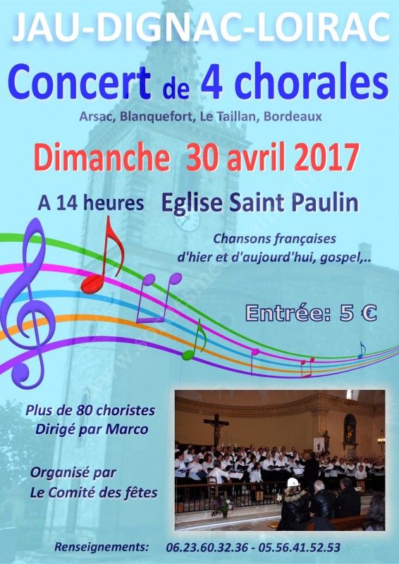 Le Comité des fêtes organise un Concert de 4 chorales (Arsac, Blanquefort, Le Taillan et Bordeaux) à Jau Dignac et Loirac le dimanche 30 Avril 2017.