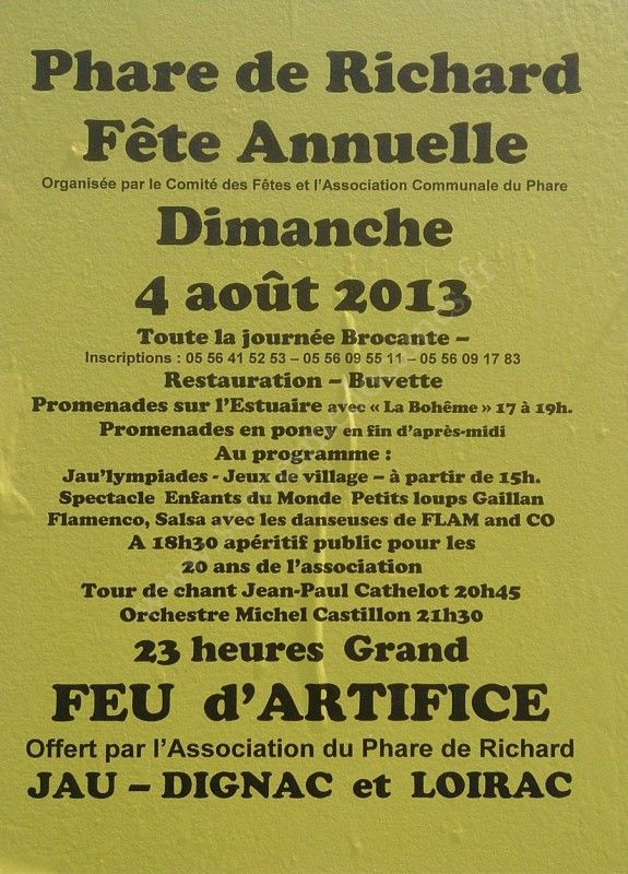 Comme tout les ans, le Phare de Richard de Jau-Dignac et Loirac s'anime pour la journée et met ses plus beaux atouts en valeur le soir pour le feu d'artifice.