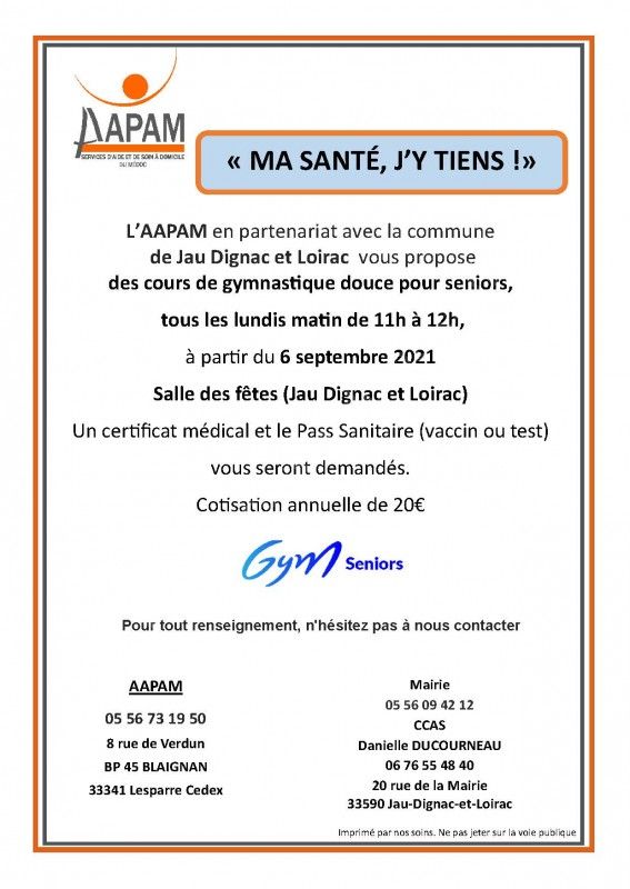 L’AAPAM en partenariat avec la commune de Jau Dignac et Loirac vous propose des cours de gymnastique douce pour seniors, tous les lundis matin.