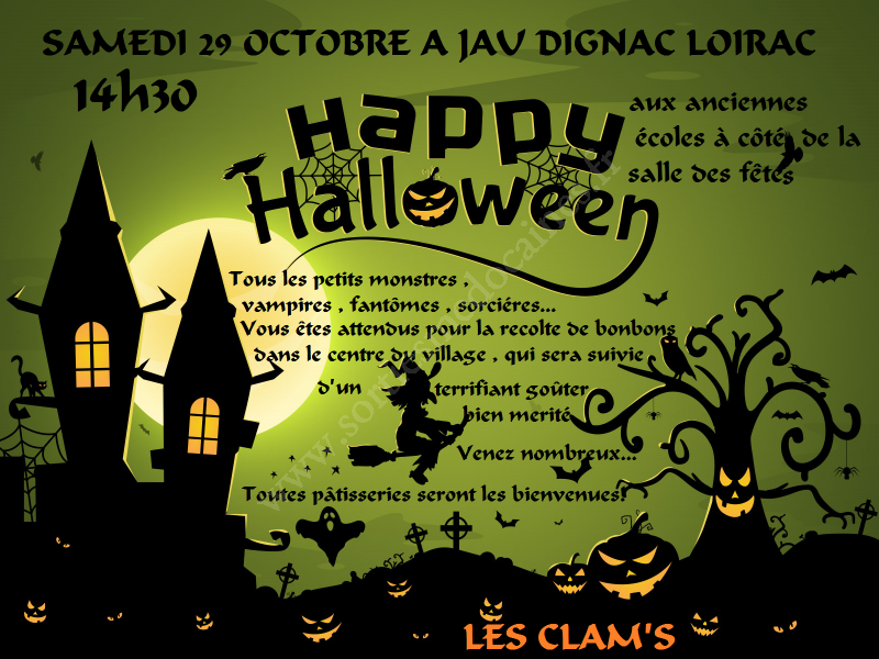 Vous êtes tous attendus le samedi 29 octobres 2016, pour la récolte de bonbons dans le centre du village, qui sera suivie d'un terrifiant goûter bien mérité.