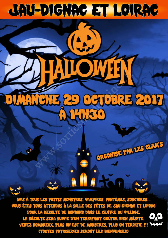 Avis à tous les petits monstres, vampires, fantômes, sorcières... Les Clam's organisent la fête d'Halloween le dimanche 29 Octobre 2017 à Jau-Dignac et Loirac pour la récolte de bonbons dans le centre du village.