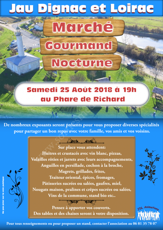 Venez flâner, déguster et passer un agréable moment en vous rendant au Marché Gourmand organisé par l'association JDL Animations le samedi 25 Août 2018 Phare de Richard.