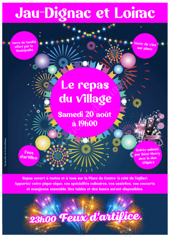 La Municipalité organise "Le repas du village" le samedi 20 août 2022 à partir de 19h00 sur la place du Centre. (à côté de l'église)