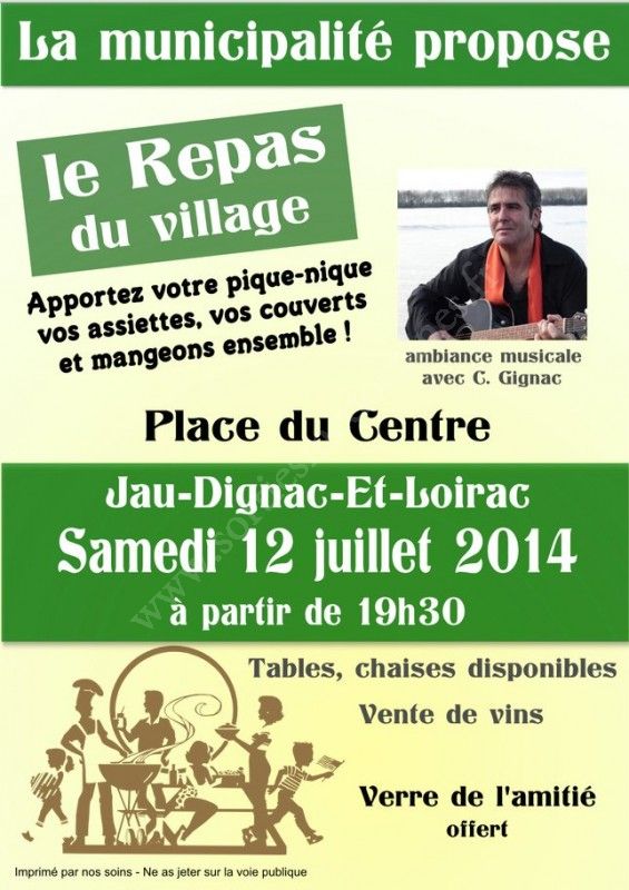 Rendez-vous ensuite sur la place du village en début de soirée pour un grand pique nique ouvert à tous. Apportons nos paniers repas et mangeons ensemble en musique avec le chanteur Chrsitian Gignac. Les tables et les chaises sont fournis, les vins de la commune sont en vente sur place.