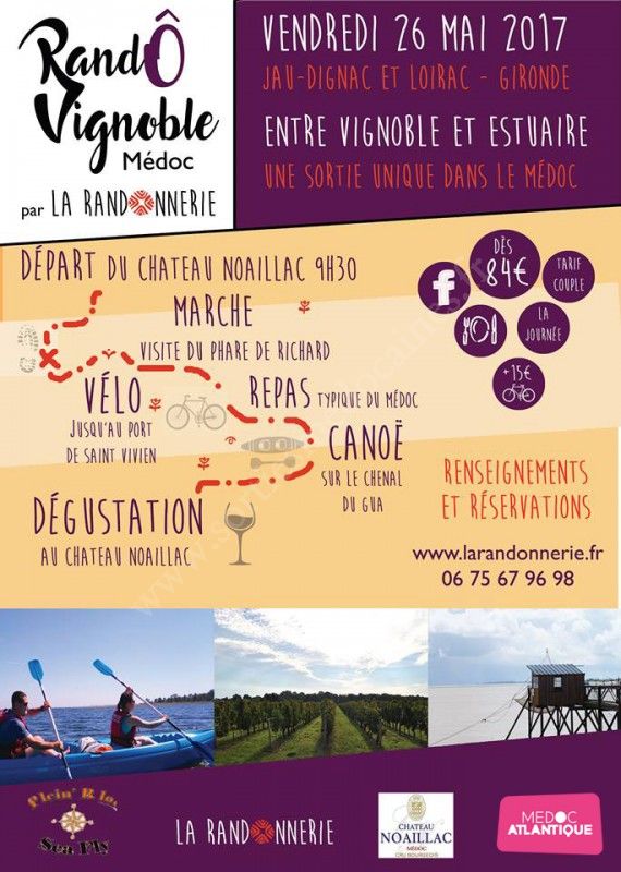Entre vignoble et estuaire, cette Rando est une invitation au voyage au cœur de ces paysages diversifiés qui caractérisent le Médoc. Au départ du Château Noaillac à Jau-Dignac-et-Loirac (Gironde), vous partirez pour une journée riche en activité (marche, vélo, canoë). Un bon repas local vous sera servi au pied du phare de richard. L'excursion se finira au château par une dégustation de vin.