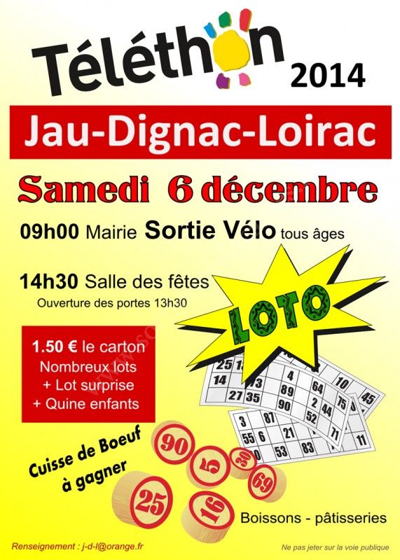 La municipalité organise le loto du Téléthon à 14h30 à la salle des fêtes de Jau-Dignac et Loirac.