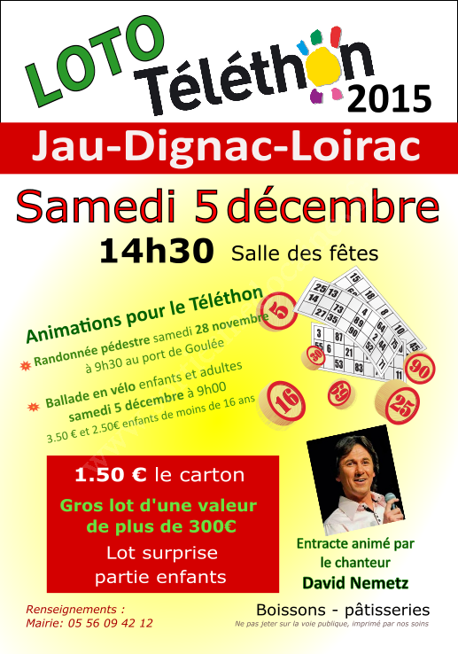 Le 5 décembre 2015, dans la salle des fêtes de Jau-Dignac et Loirac, un grand loto est organisé par les associations du village au profit du Téléthon (Tarif : 1.50€ le carton)