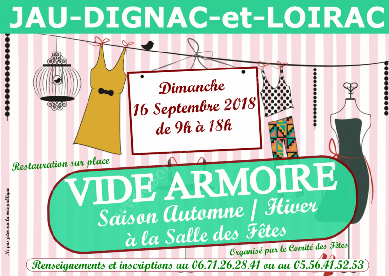 Le Comité des Fêtes organise son Vide-Armoire "Automne / Hiver" le 16 Septembre 2018 à la salle des fêtes de Jau Dignac et Loirac.