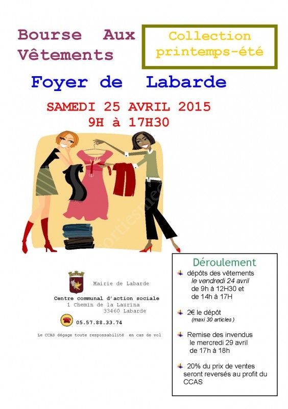 - Dépôts des vêtements : le vendredi 24 avril de 9h00 à 12h30 et de 14h00 à 17h00