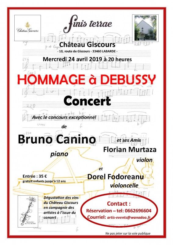 L’Association FINIS TERRAE (soutien aux jeunes musiciens) propose un concert "HOMMAGE à DEBUSSY", avec le concours exceptionnel de BRUNO CANINO, pianiste de renommée mondiale, et de ses Amis DOREL FODOREANU, violoncelliste, concertiste international, membre fondateur du Quatuor Enesco, et FLORIAN MURTAZA, violoniste, membre de l’ONBA, concertiste international.