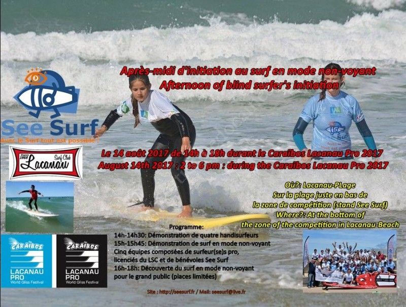 See Surf vous propose avec le soutien du Caraïbos Lacanau Pro et du Lacanau Surf Club de découvrir un après-midi d'initiation au surf en mode non-voyant!