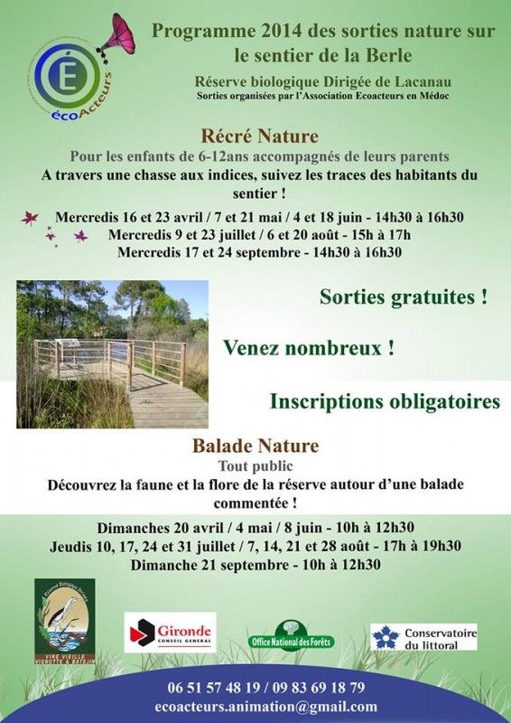 Dans le cadre du « Dispositif Grand Public » soutenu par le Conseil Général de la Gironde et en partenariat avec l’ONF, Ecoacteurs en Médoc vous propose gratuitement des visites guidées ludiques basées sur la découverte de la biodiversité de la réserve biologique dirigée de Vire Vieille, Vignotte et Batejin de Lacanau. Cet espace naturel sensible d’intérêt patrimonial spécifique est caractéristique du système humide d’arrière-dune. Le Conservatoire du Littoral, propriétaire du site, contribue à sa protection. Deux types de sorties sont proposés en fonction du public concerné et sont encadrés par un animateur.