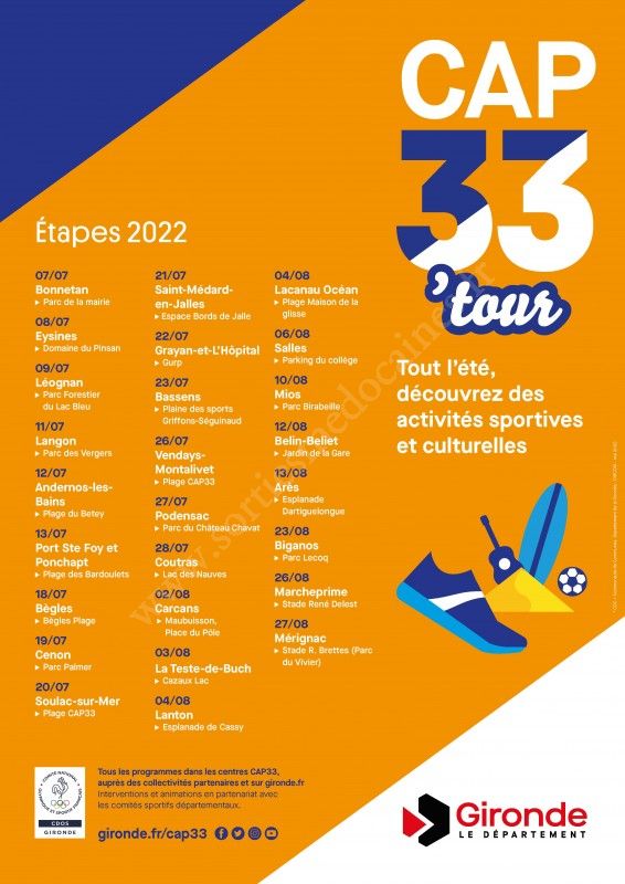 Le CAP33'tour vient animer les centres CAP33 lors des 26 étapes de la tournée avec des activités proposées par les comités sportifs départementaux : Athlétisme, Aviron, Badminton, Char à voile, Course d’orientation, Cyclisme, Escrime, Etudes et Sports sous-marins, Football, Handball, Handisport, Hockey sur Gazon, Lutte, Natation, Pelote Basque, Roller et Skateboard, Rugby, Rugby à XIII, Savate Boxe française, Sport adapté, Sport en milieu rural, Surf, Tennis, Volley Ball, le CDOS et Drop de Béton (Beach Rugby).