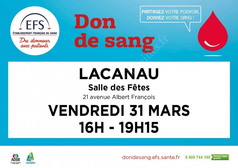 Venez donner votre sang à Lacanau le 31 mars 2017, vous pourrez ainsi sauver des vies !!!