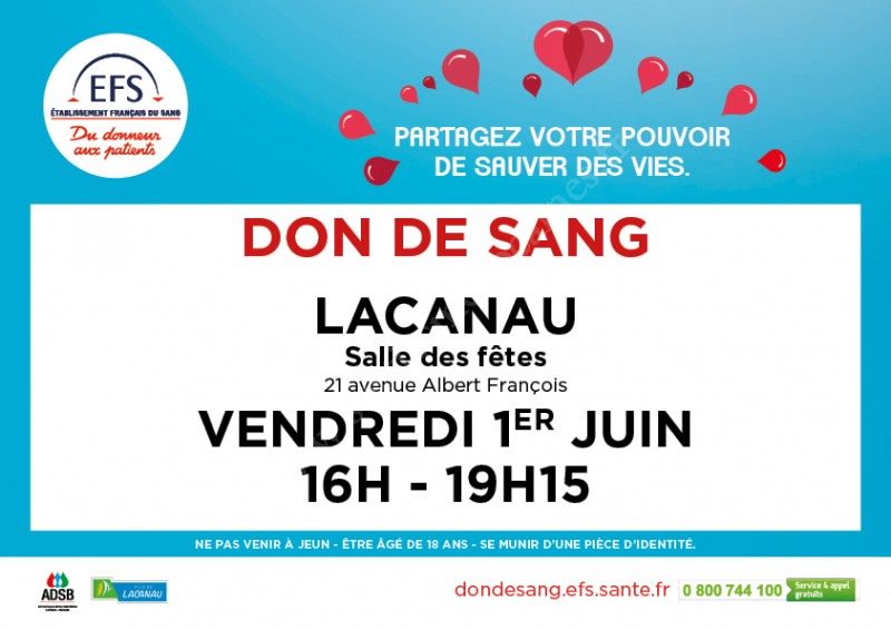 Venez donner votre sang à Lacanau le 1er Juin 2018, vous pourrez ainsi sauver des vies !!!