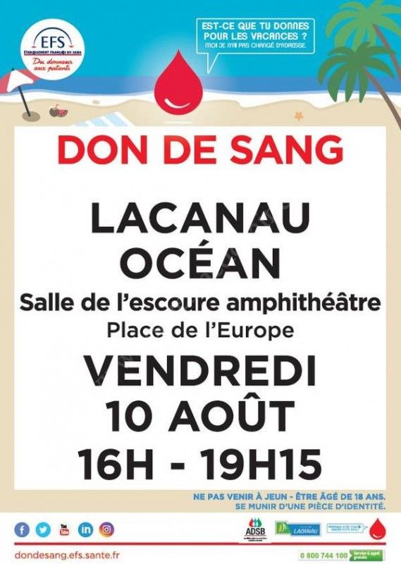 Venez donner votre sang à Lacanau le vendredi 10 août 2018, vous pourrez ainsi sauver des vies !!!