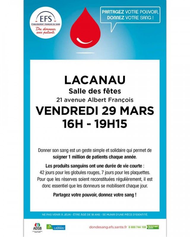 Venez donner votre sang à Lacanau le vendredi 29 mars 2019, vous pourrez ainsi sauver des vies !!!