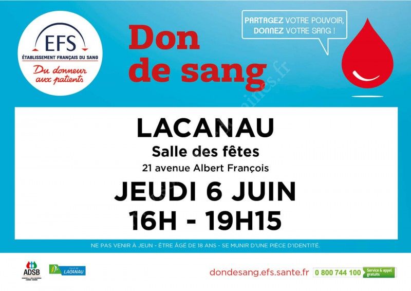 Venez donner votre sang à Lacanau le jeudi 6 juin 2019, vous pourrez ainsi sauver des vies !!!