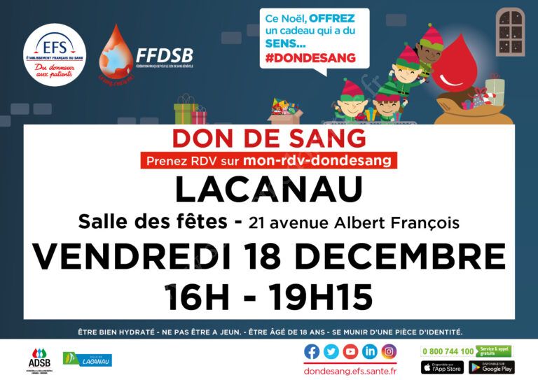 Venez donner votre sang à Lacanau le vendredi 18 décembre 2020, vous pourrez ainsi sauver des vies !!!
