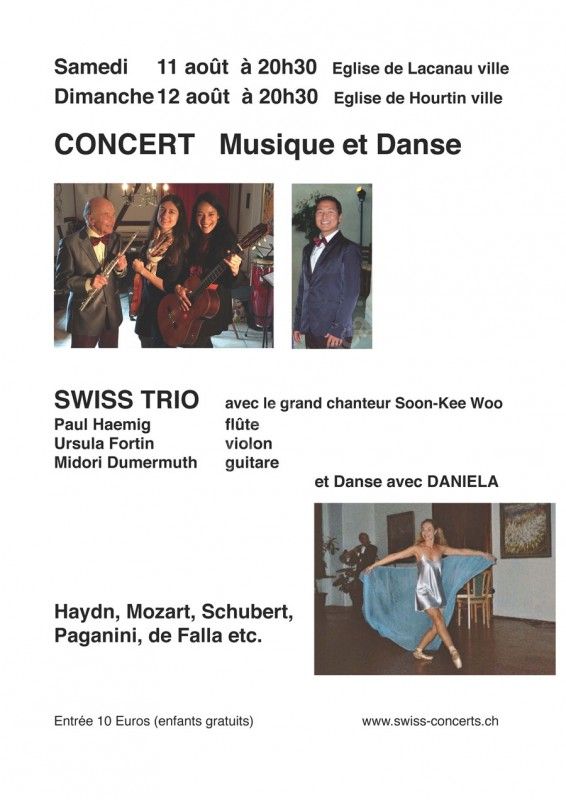 Swiss Trio, avec le chanteur Soon-Kee Woo, accompagné de Paul Heming (flûte), Ursula Fortin (violon) et Midori Dumermuth (guitare), et de la danseuse Daniela, évolueront autour de Haydn, Mozart, Schubert, Paganini, de Falla...