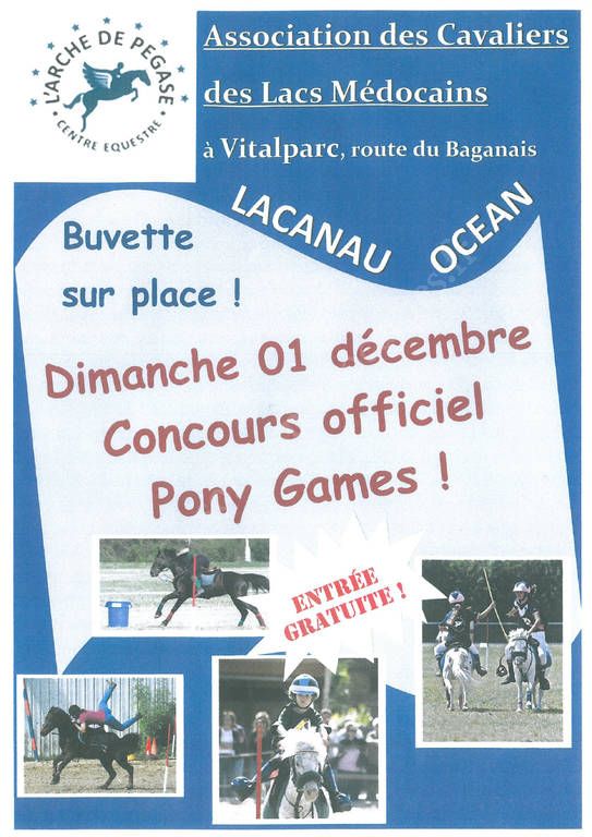 L'Association des Cavaliers des Lacs Médocains vous invite le Dimanche 1er Décembre au concours officiel "Pony Games", à Vitalparc !
