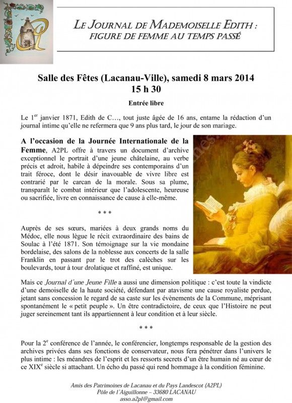 A l’occasion de la Journée Internationale de la Femme, A2PL offre à travers un document d’archive exceptionnel le portrait d’une jeune châtelaine, au verbe précis et adroit, habile à dépeindre ses contemporains d’un trait féroce, dont le désir inavouable de vivre libre est contrarié par le carcan de la morale. Sous sa plume, transparaît le combat intérieur que l’adolescente, heureuse ou sacrifiée, livre en connaissance de cause à elle-même.