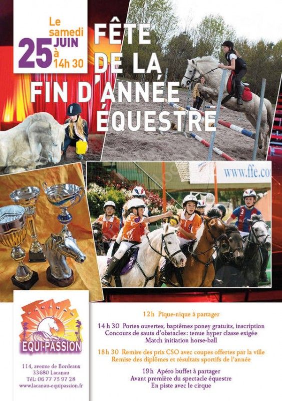 - 14h30 : Portes ouvertes, baptêmes poney gratuits, inscription. Concours de sauts d'obstacles, match d'initiation au horse-ball