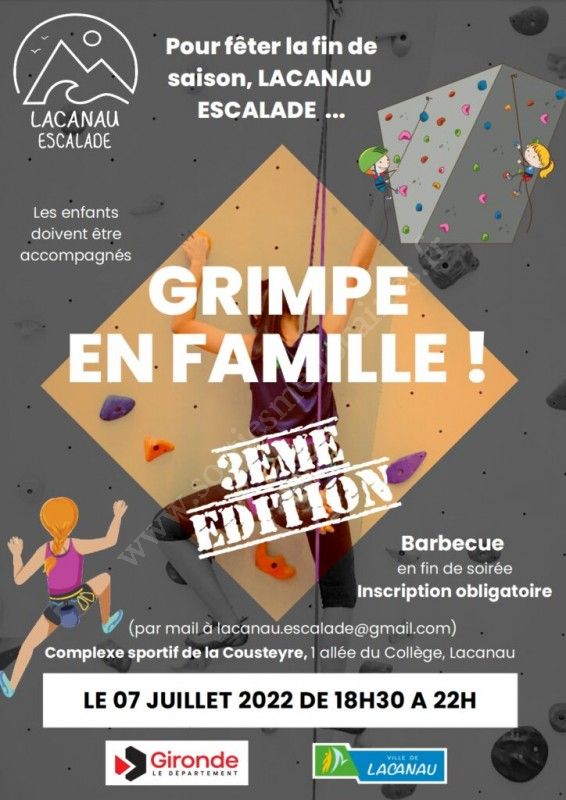 Pour fêter la fin d’année scolaire, l’association Lacanau Escalade organise la troisième édition de "Grimpe en famille", dans une ambiance conviviale qui prendra son paroxysme lors du barbecue – grillade organisé en clôture.