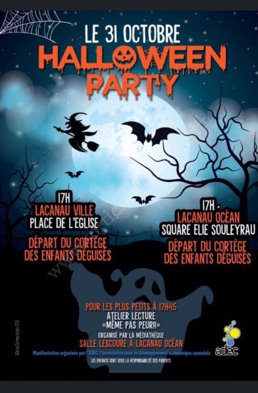 Distribution de bonbons par les membres de l'ADEC, pause sous les Halles de la Gaité où d'autres membres de l'ADEC distribueront des friandises (maléfiques ?), animation Zumba Kids par SPOT Coaching, balade en poney avec Lacanau Equipassion et pour le final accueil des enfants à la caserne des pompiers (de l'horreur ?) (visite et distribution de bonbons)