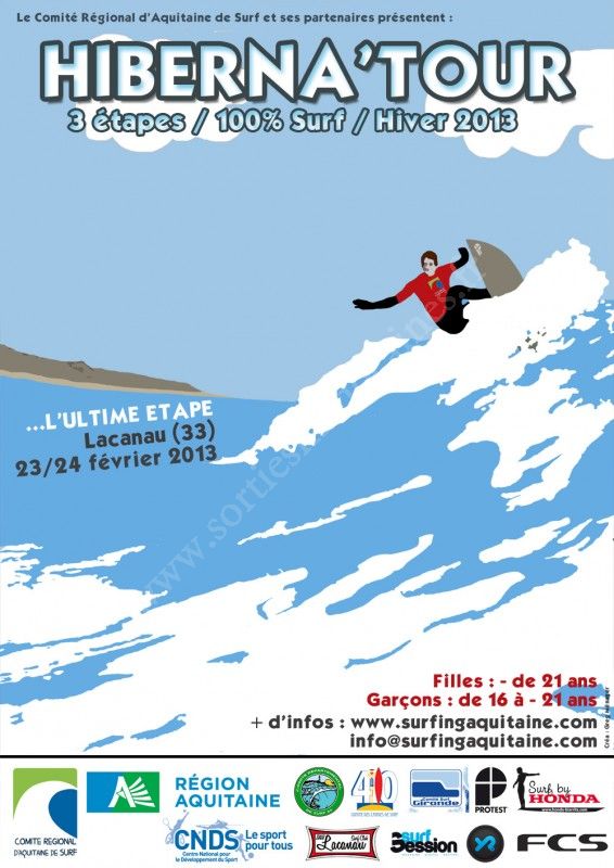 A tous les surfeurs téméraires, nous vous annonçons que la dernière étape de l'Hiberna'Tour se déroulera le dimanche 24 février 2013 sur les plages de Lacanau, le rendez-vous est à 9h, face au surf club. Cagoules, gants, chaussons et soupe chaude seront de la partie!!