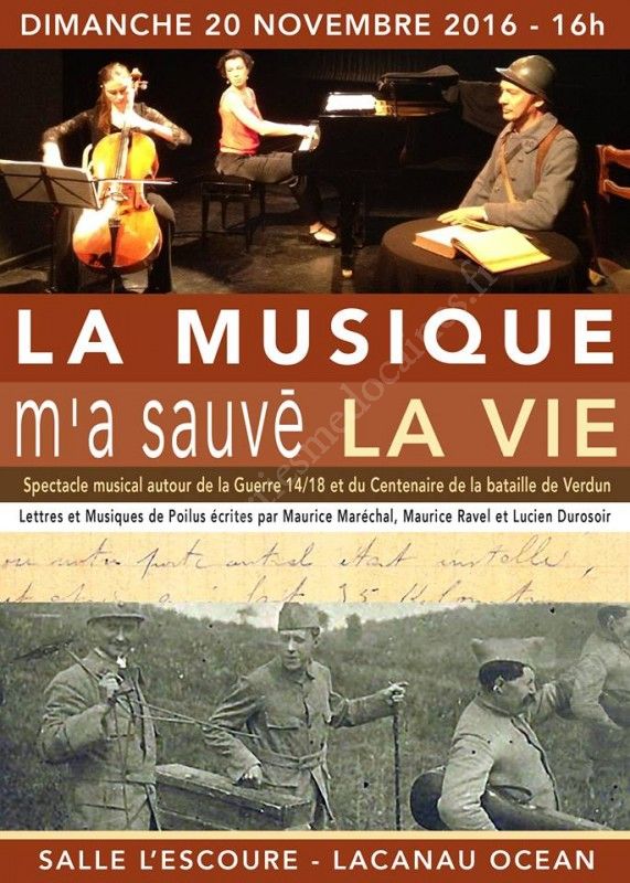 En commémoration de la Grande Guerre, l'Association Culturel le de Lacanau présente un concert - lectures à partir de lettres, témoignages bouleversants, qu'écrivaient chaque jour ces soldats musiciens à leur mère. La musique les aidait à survivre et ,en 1916, à la demande du Général Mangin, ils constituèrent avec André Caplet (alto) et Henri Lemoine (violon) un ensemble à cordes qui rejoignit "Les Musiciens du Général". La barbarie côtoyait l'art, et le sublime, l'horreur. C'est ainsi que Lucien Durosoir écrivit à sa mère: "Mon violon m'a sauvé la vie"