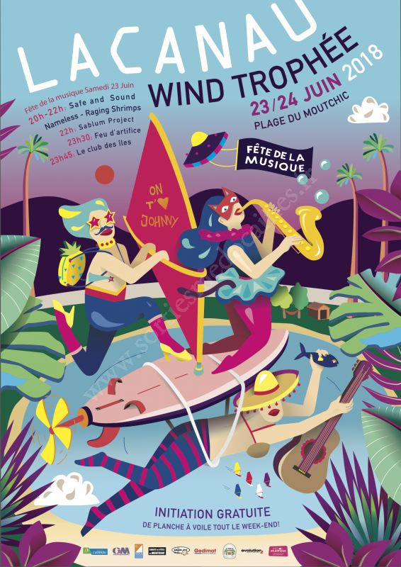 Des windsurfeurs déguisés, du matériel des années 80, une buvette tenue par des Rugbymans, et une brochette d’anciens champions venus pour faire la fête, le LACANAU WIND TROPHÉE, c’est 2 jours de festivités, pendant lesquels se déroulent une épreuve de planche à voile et la fête de la musique.