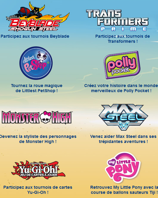Venez vous amuser avec Gulli, Canal J et TiJi et retrouvez aussi les animations de vos programmes préférés : Monster High, Beyblade, Transformers, Littlest Petshop, Yu-gi-oh…!