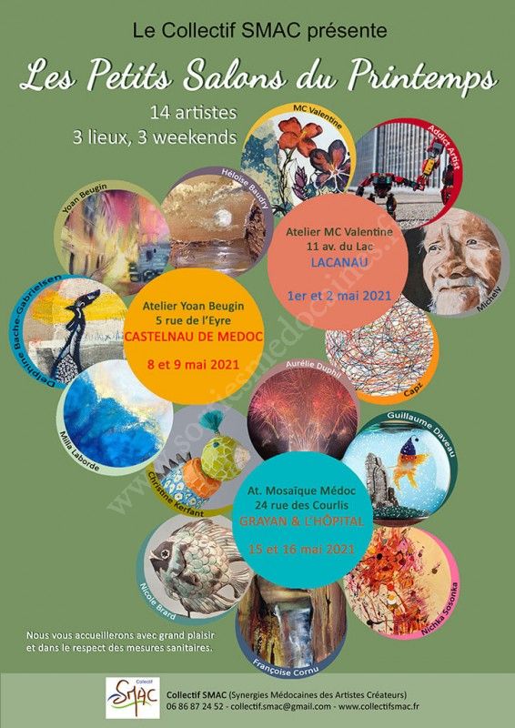 14 artistes vous présenteront leurs œuvres, leurs nouvelles créations, sur 3 lieux médocains, sur les 3 premiers week-ends de mai :