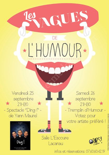 - Samedi 26 septembre 2015 : Soirée Tremplin d'humour : venez votez pour votre artiste préféré ! 4 nouveaux humoristes relèveront le défi de se présenter devant vous mais vous seul désignerez le grand gagnant de la soiré !